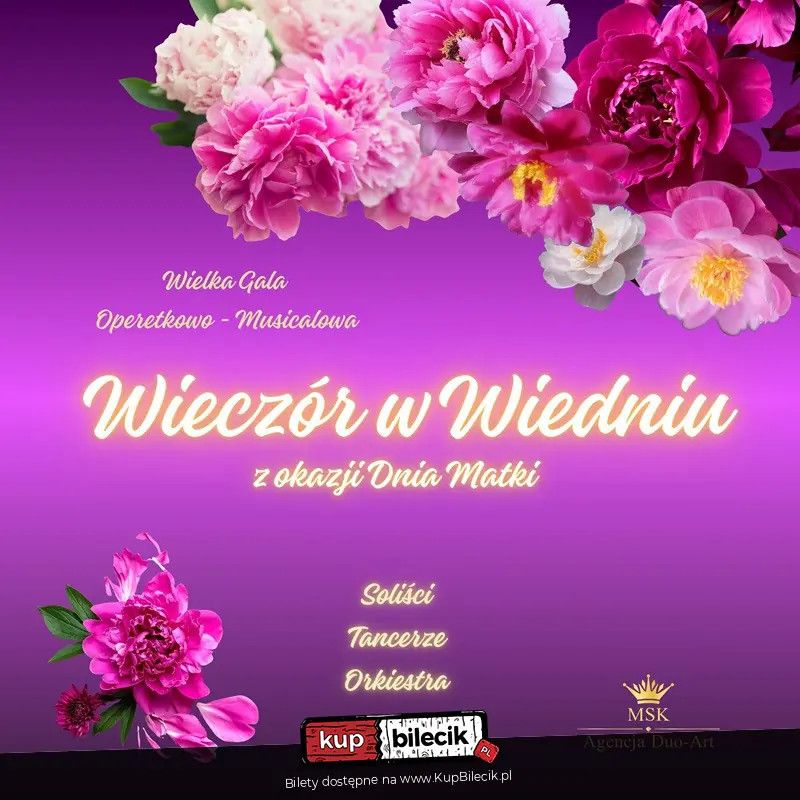 Zapraszamy na wyjątkowy koncert "Wieczór w Wiedniu", przygotowany z myślą o wszystkich Mamach i ich bliskich. Tego wieczoru przeniesiemy się do muzycznego serca Europy - do Wiednia, miasta walca, opery i niepowtarzalnego uroku. W programie zabrzmią najpiękniejsze walce, polki i arie operetkowe mistrzów wiedeńskiej klasyki, m.in. Johanna Straussa, Franza Lehára i Emmericha Kálmána. Pełne wdzięku melodie, elegancja wykonania i romantyczna atmosfera sprawią, że będzie to wieczór pełen wzruszeń, radości i niezapomnianych emocji. Bilety do nabycia na: KupBilecik.pl